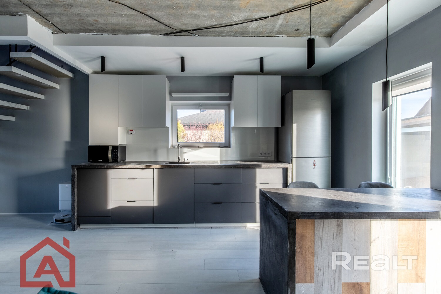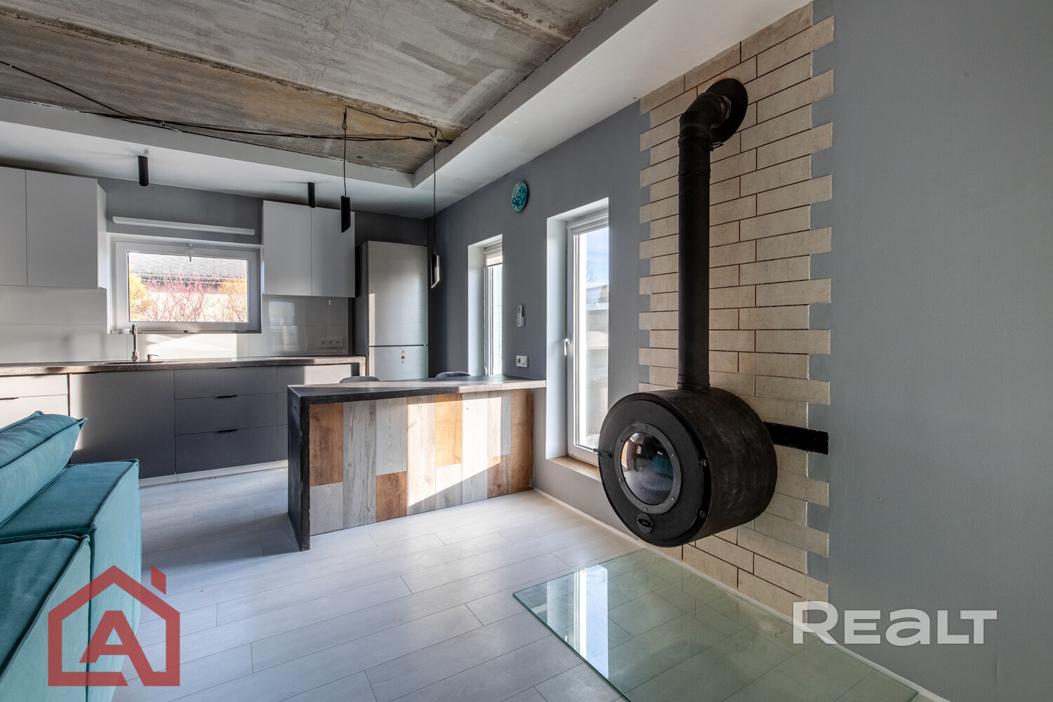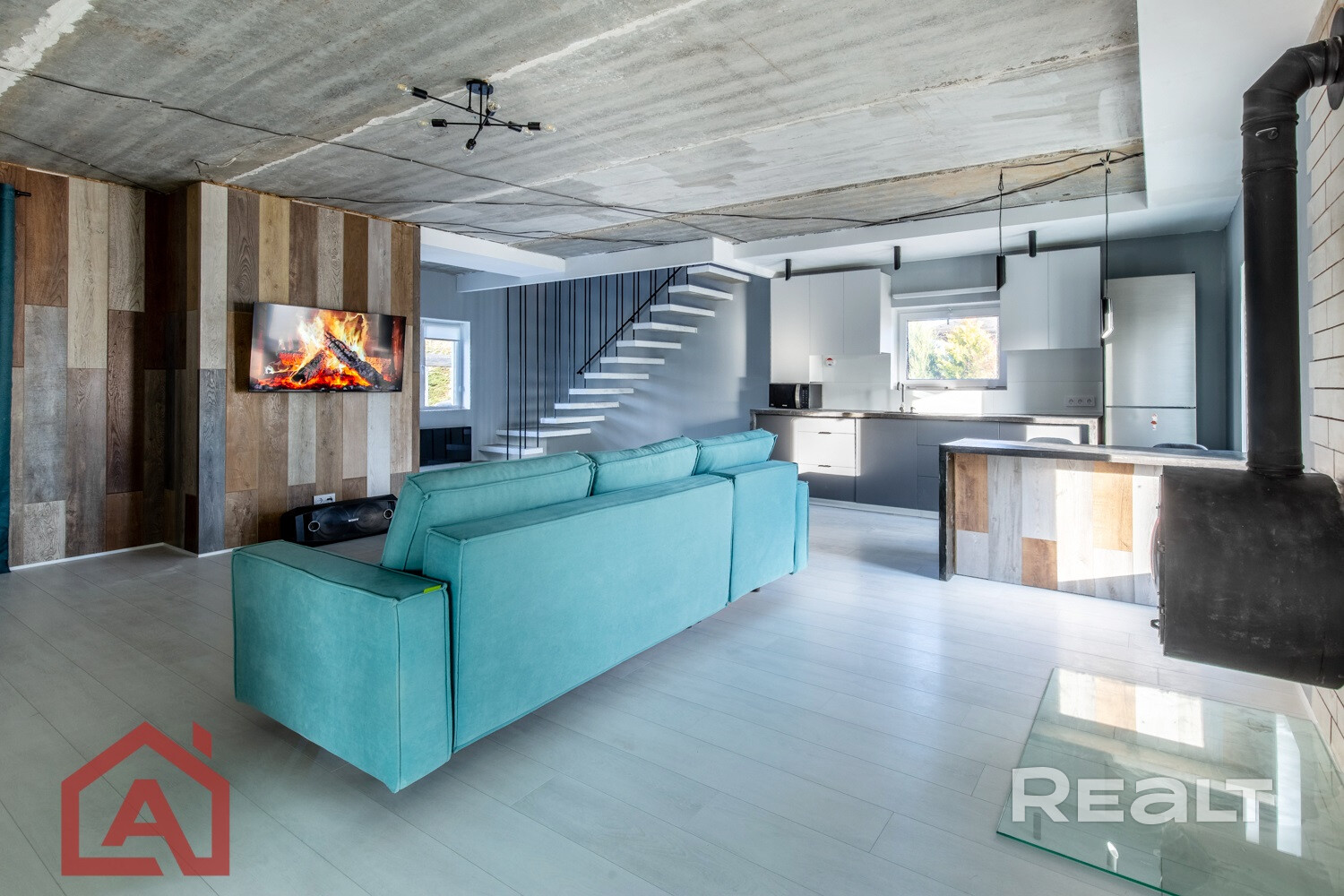 Общая площадь 153,5 м2. На первом этаже расположены гостиная с зонами кухни и столовой, закрытая терраса, прихожая, санузел, топочная, жилая комната. На втором этаже готова только одна комната.
