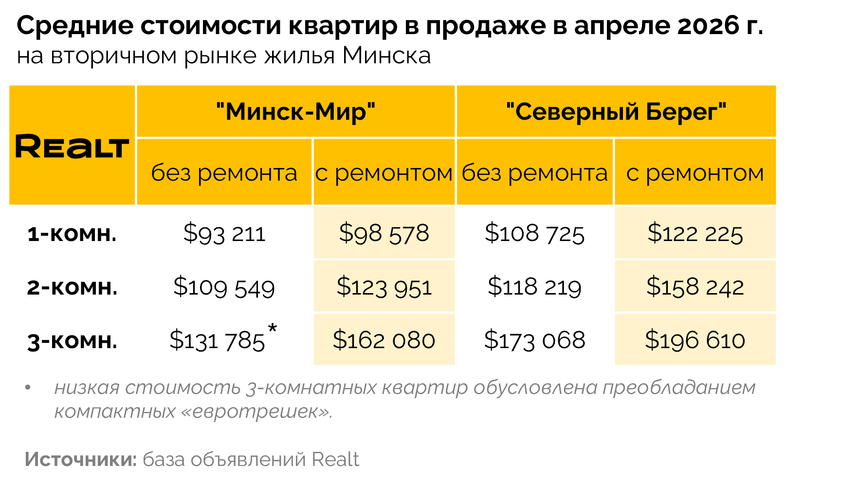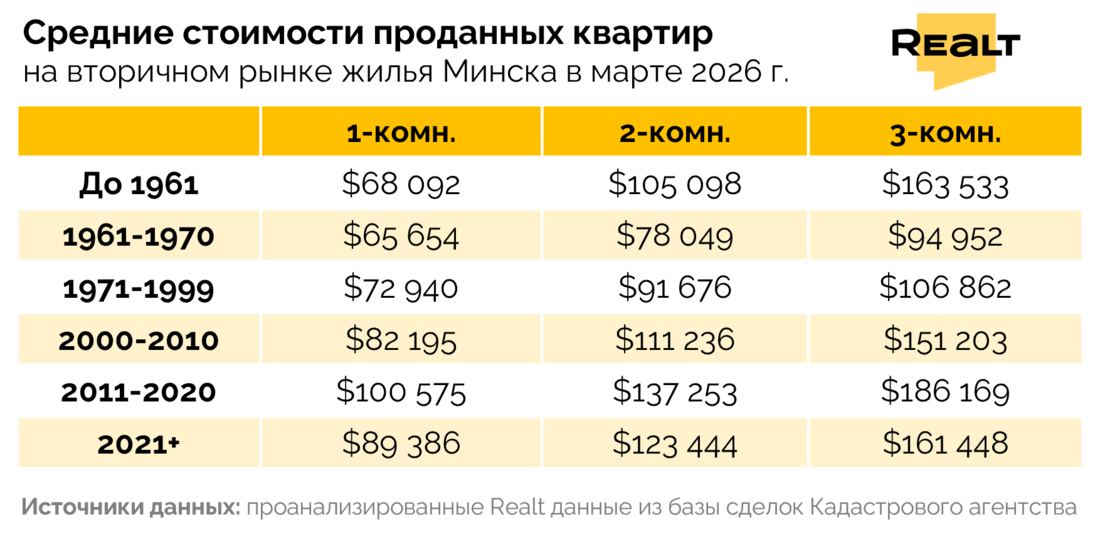 Аналогичная ситуация наблюдается и в Минск-Мире: квартиры с ремонтом продолжают постепенно дорожать, а варианты без отделки начали корректироваться вниз. С начала года однокомнатные и двухкомнатные без ремонта потеряли около 10%: сейчас однушку можно найти в среднем за 93 000 $, двушку — за 110 000 $.