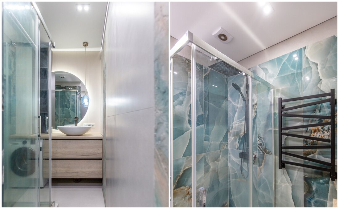 Санузел тут раздельный. В ванной сделали душ, поместилась и стиральная машина.