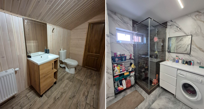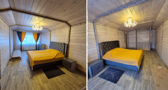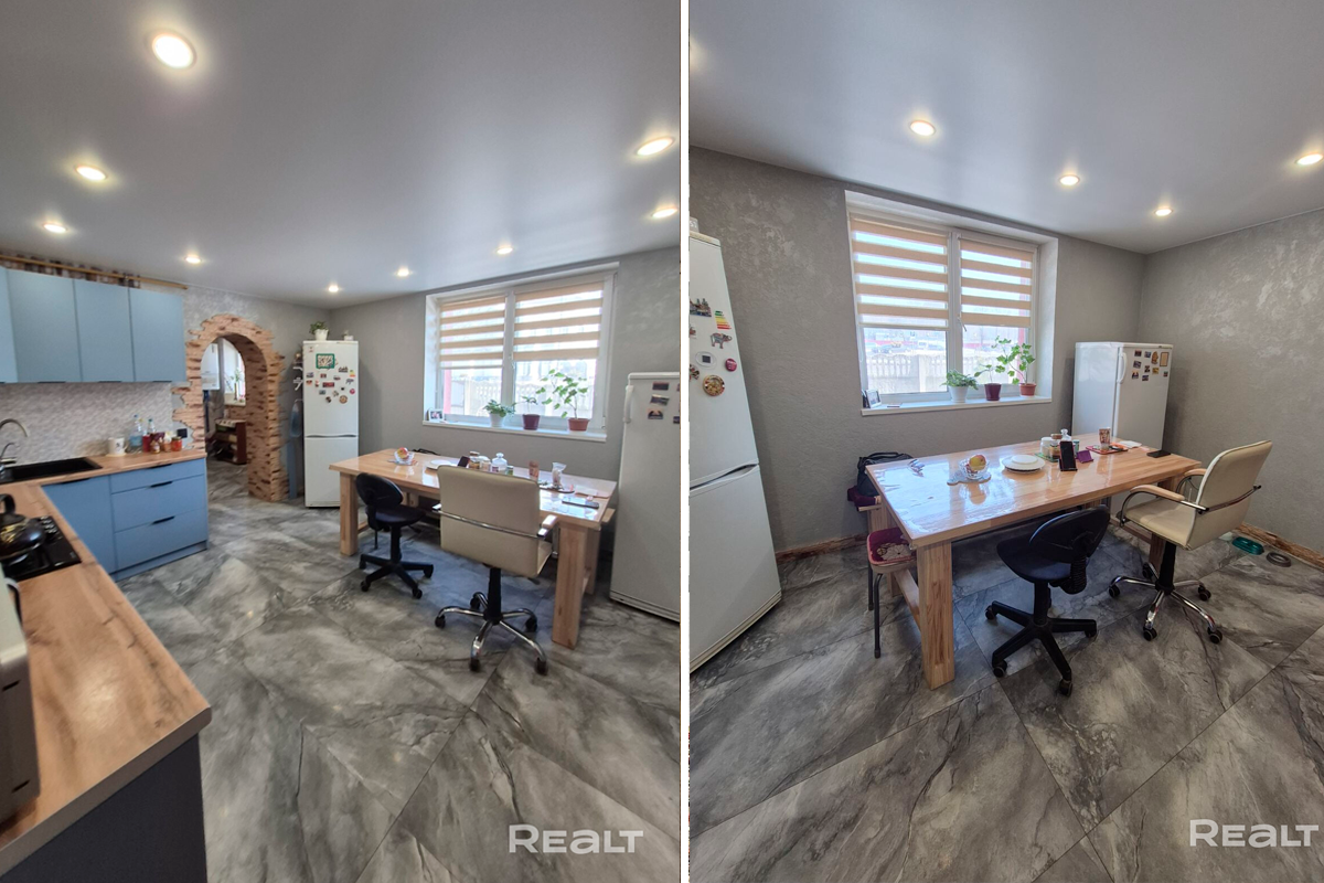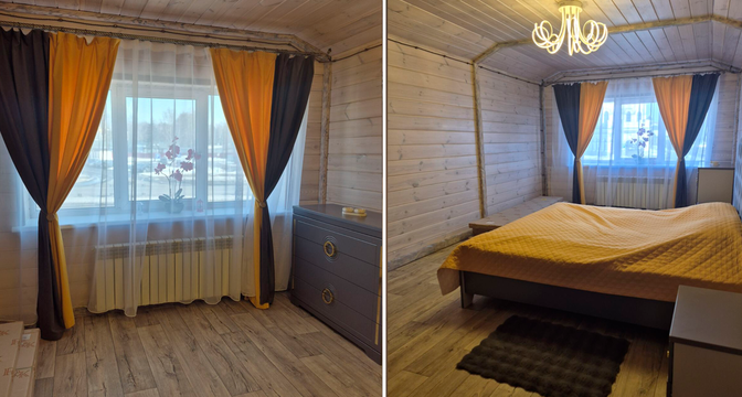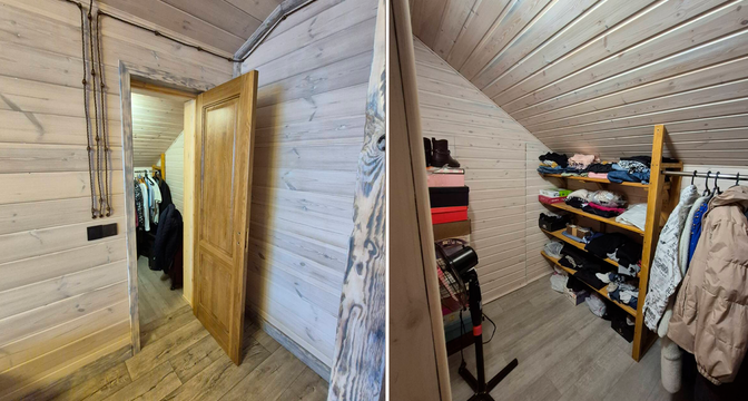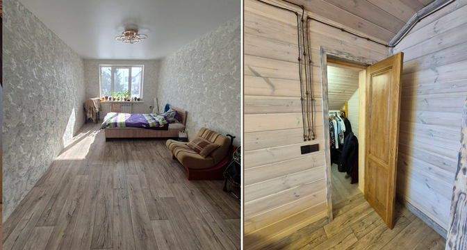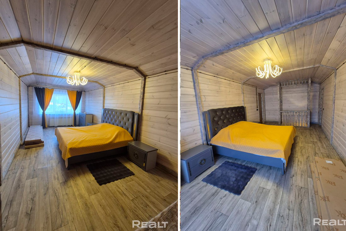 Общая площадь дома — 231 квадрат, 151 из которых приходится на жилую площадь. В доме четыре изолированные комнаты и кухня-гостиная площадью 16 квадратных метров. В санузле установлена душевая кабина. На втором этаже есть гардеробная.