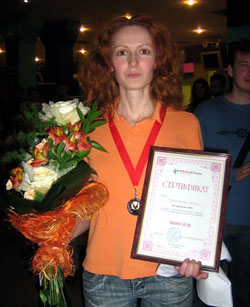 На зависть всем представителям мужской половины, лучший личный результат показала девушка — Оксана Синица из команды Компьютерра. В номинации «Лучший женский результат» Оксана получила прелестный букет цветов от компании Webcom Media и подписку на полгода на журнал «Бизнес-леди» от рекламного агентства «АртМедиаСтиль»!
