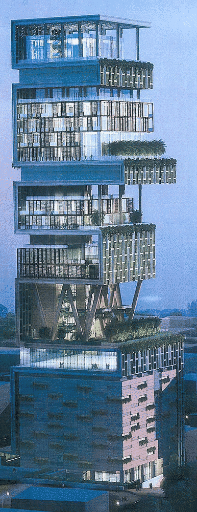 Владелец состояния, которое оценивается в $ 27 млрд., назвал свое новое жилище «Антилия» в честь мифического острова в Атлантическом океане. Строительство 170-метровой 27-этажной башни длилось семь лет.