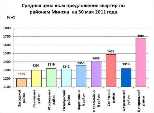 На 30 мая лидером по величине средних цен предложения квартир в Минске является Центральный (1681 $/кв.м) район. Самая низкая средняя цена предложения в Заводском (1199 $/кв.м) районе.