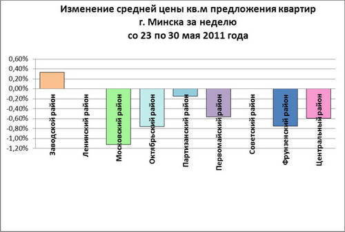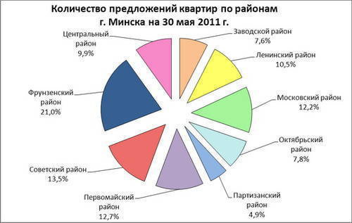 Лидером по объему предложения вторичного жилья в г. Минске на 30 мая 2011 года является Фрунзенский район, 21% от всего предложения. Количество предложений квартир в базе Realt.by за неделю уменьшилось на 0,68%.