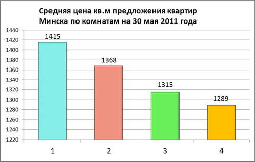 За неделю с 23 по 30 мая 2011 года по данным аналитического центра Realt.by средняя цена предложения квадратного метра квартир на вторичном рынке жилья в г. Минске уменьшилась на 0,37% и составляет 1359 $.