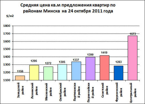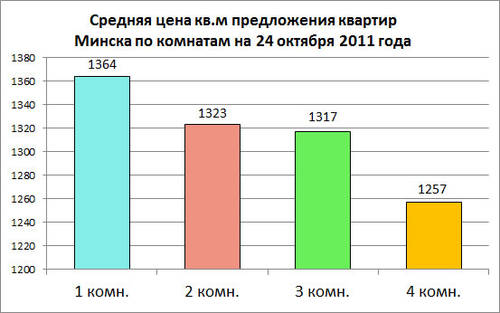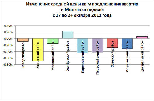 За неделю с 17 по 24 октября 2011 года по данным аналитического центра Realt.by средняя цена предложения квадратного метра квартир на вторичном рынке жилья в г. Минске упала на 0,38%, составив 1327 $.