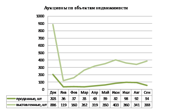 Всего для продажи через аукцион в базе данных портала было размещено 534 объекта в июле, 452 объекта в августе и 640 объектов в сентябре, суммарно несколько выше показателей второго квартала.