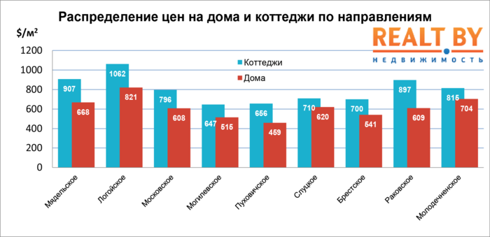 Основной объем предложения сконцентрирован на 3 направлениях — Логойском, Московском и Молодечненском, совокупная доля которых занимает чуть более половины от всех предлагаемых объектов. Однако, следует отметить, что за 4 квартал 2012 года этот показатель сократился более чем на 10%. В то же время продаваемых объектов по направлениям на Слуцк, Брест и Мядель за последние 3 месяца стало больше.