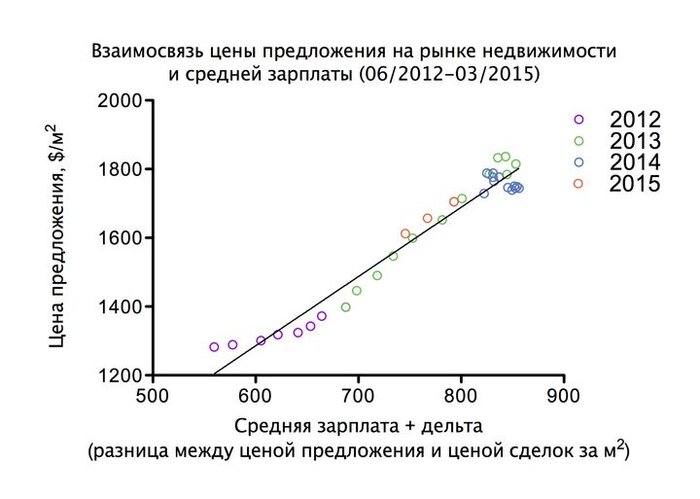 Дельту (разницу между средней ценой предложения и сделок) никто не оплачивает, так как сделки заключаются не по цене предложения, а с учетом торга. Чтобы избавиться от влияния этой плавающей величины, ее пришлось добавить к зарплате. Дельту можно было бы вместо этого вычесть из цены предложения, но тогда мы получили бы цену сделки, которая является статистически менее интересным показателем. Зарплата и разница цен (дельта) сглажены усреднением за 6 месяцев. R2=0,9534, P<0,0001.