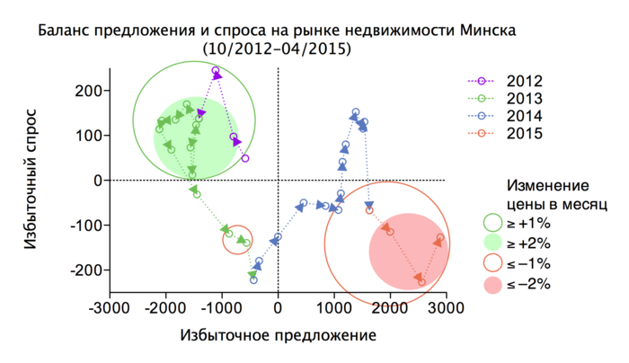 Оптимистичный вариант. При характерном для белорусской модели экономики интенсивном росте зарплат, который наблюдался после двух предыдущих девальваций, они могут достигнуть $ 550 в среднем по стране к концу года. Это соответствует средней цене предложения в 1570 $/м2 и росту цены на 0,5% от апрельского значения.