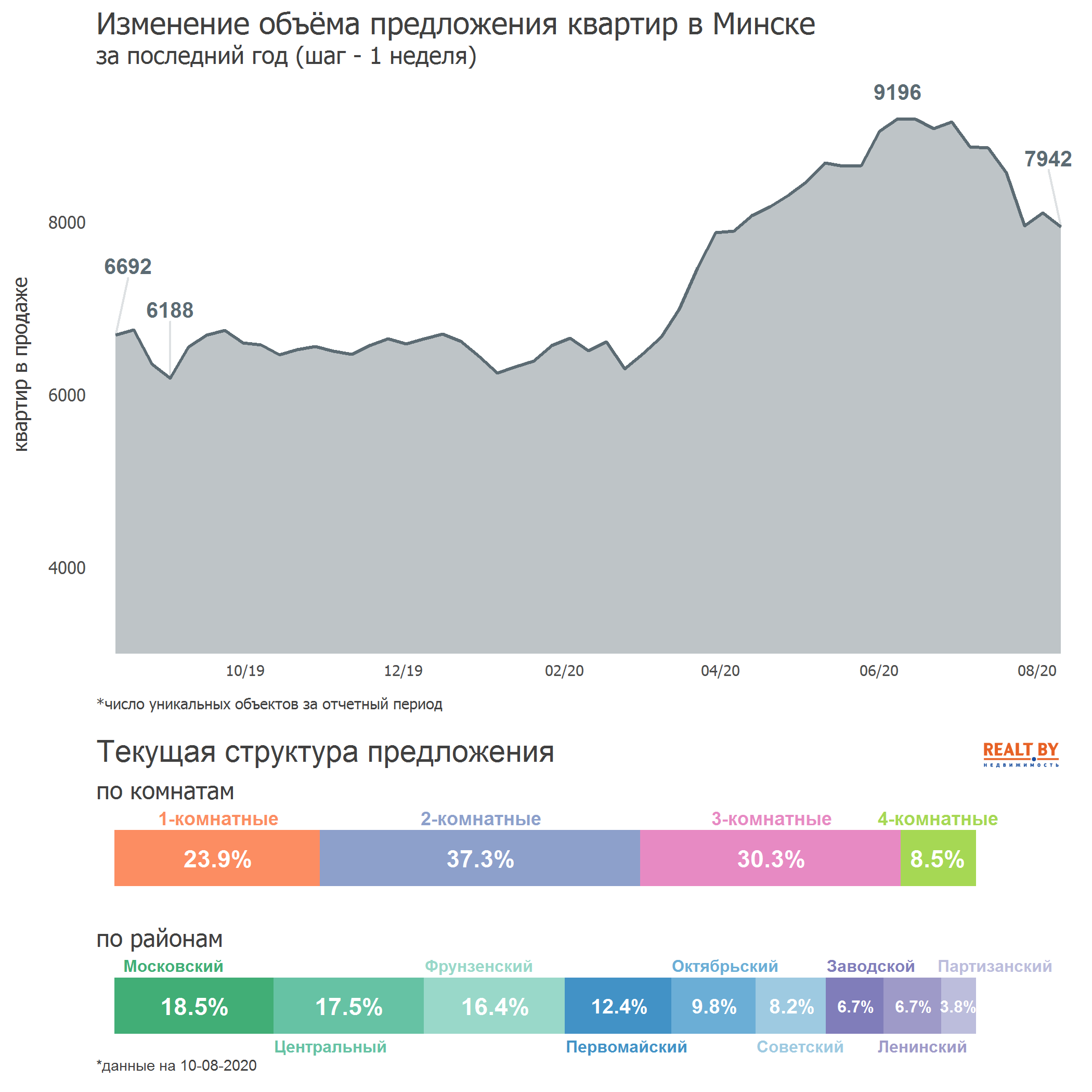 За неделю, с 3 по 10 августа 2020 года, аналитическим центром Realt.by были отмечены следующие изменения на рынке жилья города Минска: