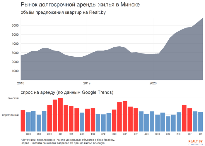 Сезон повышенного спроса в 2020 году закончился раньше обычного — активность по поиску съемного жилья в Минске существенно сократилась еще в сентябре, в октябре падение продолжилось (за месяц -3%). Как результат, число заинтересованных в аренде квартир оказалось самым низким для середины осени за последние 4 года.