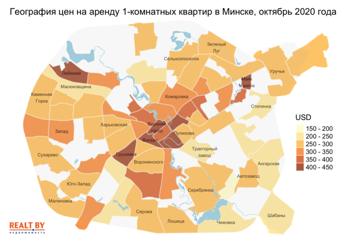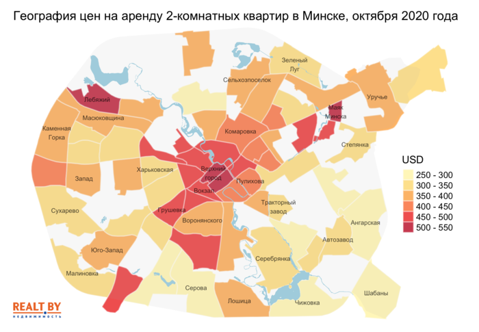 Так выглядит разбежка в ценах на аренду квартир между разными частями города:
