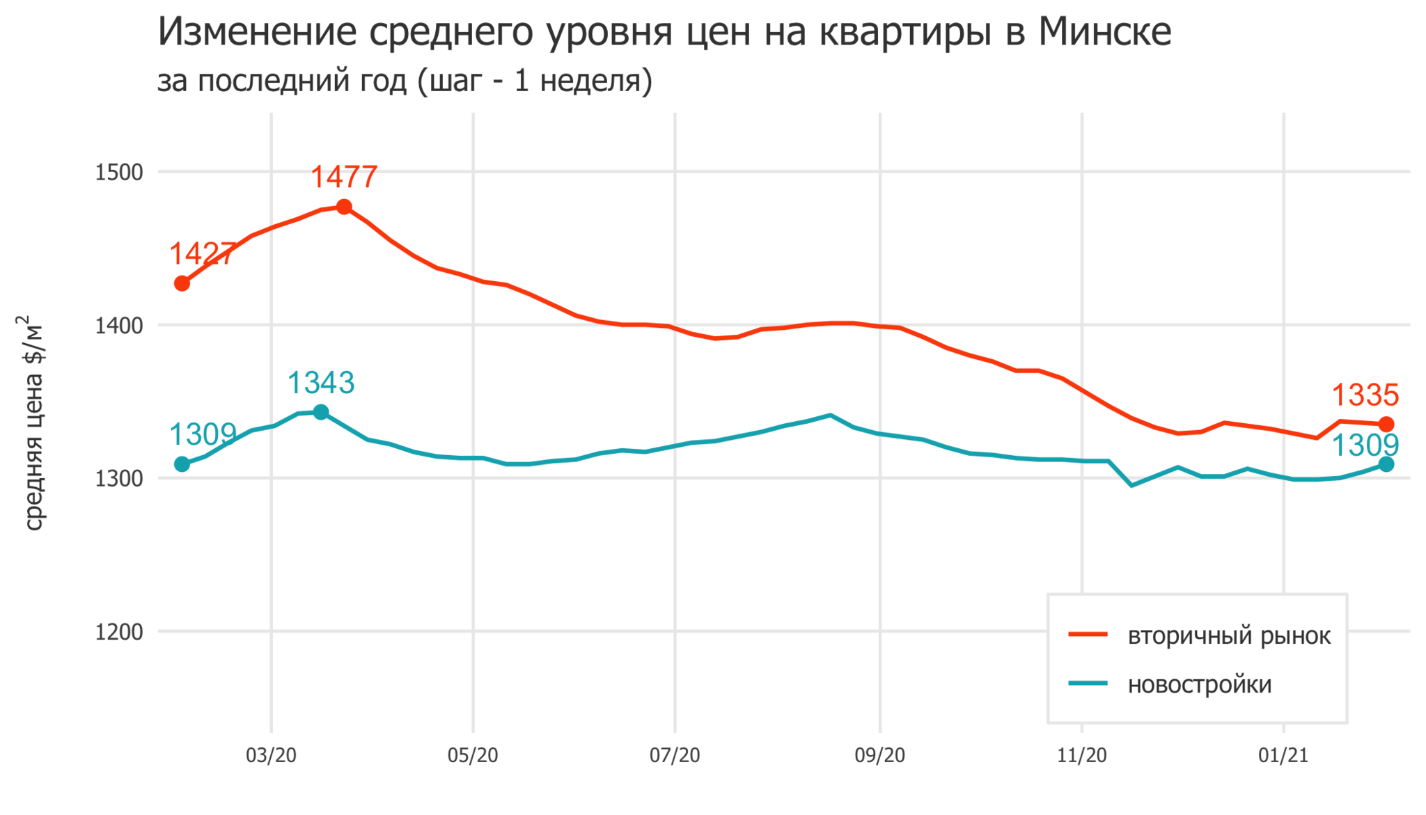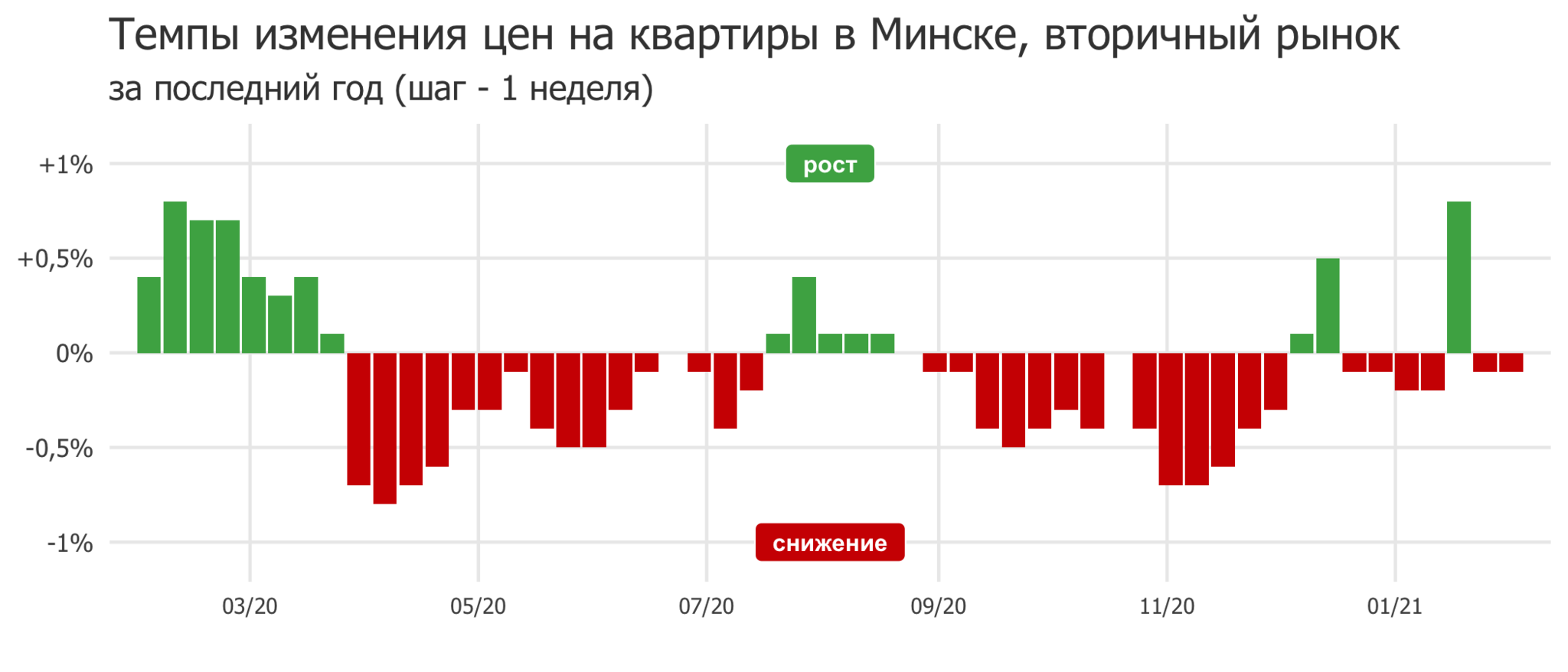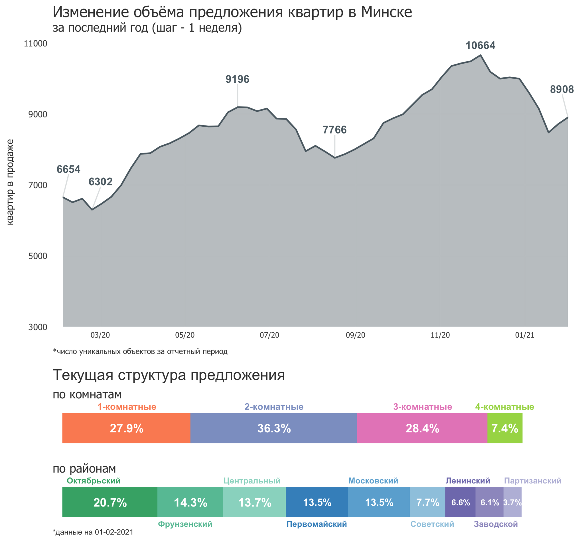 За неделю, с 25 января по 1 февраля 2021 года, аналитическим центром Realt.by были отмечены следующие изменения на рынке жилья города Минска: