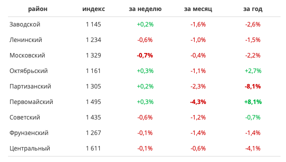 В большинстве районов города за последние семь дней предложение квартир сократилось, в наибольшей степени — в Октябрьском и Первомайском. Рост отмечался лишь в Московском районе.