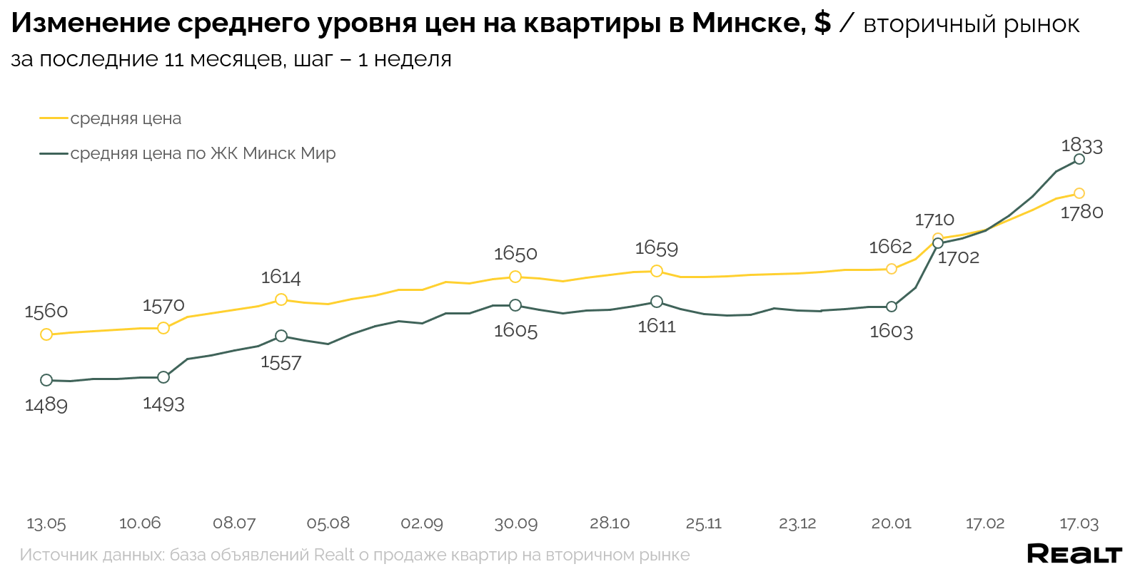 Средняя стоимость квадратного метра продолжает увеличиваться: за последнюю неделю она прибавила еще 0,5% и составила 1780 $/м2. При этом продолжили дорожать квартиры и в жилом комплексе Минск-Мир, средняя стоимость квадрата здесь стала дороже на 1%.
