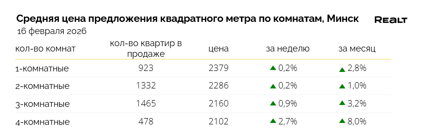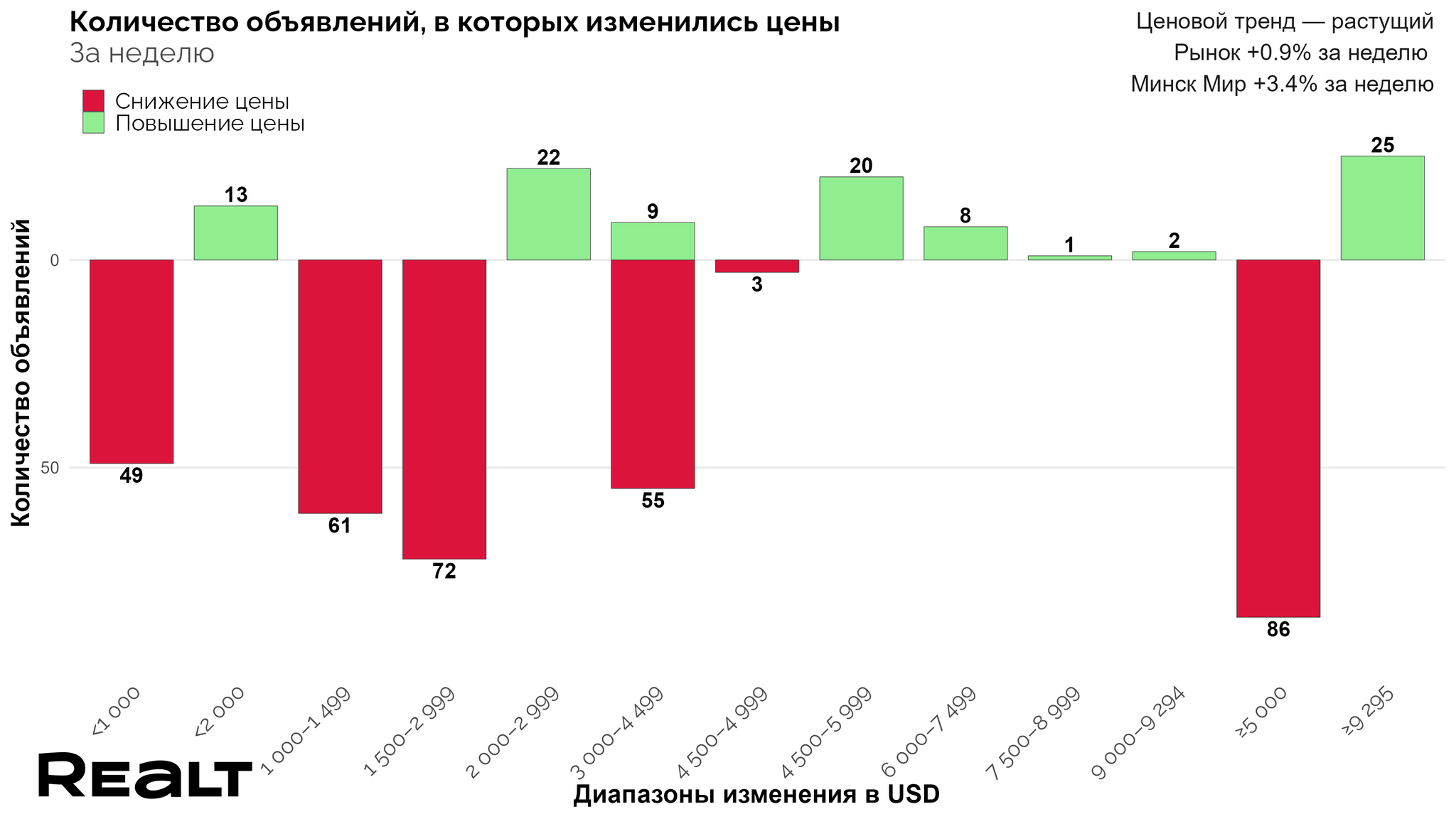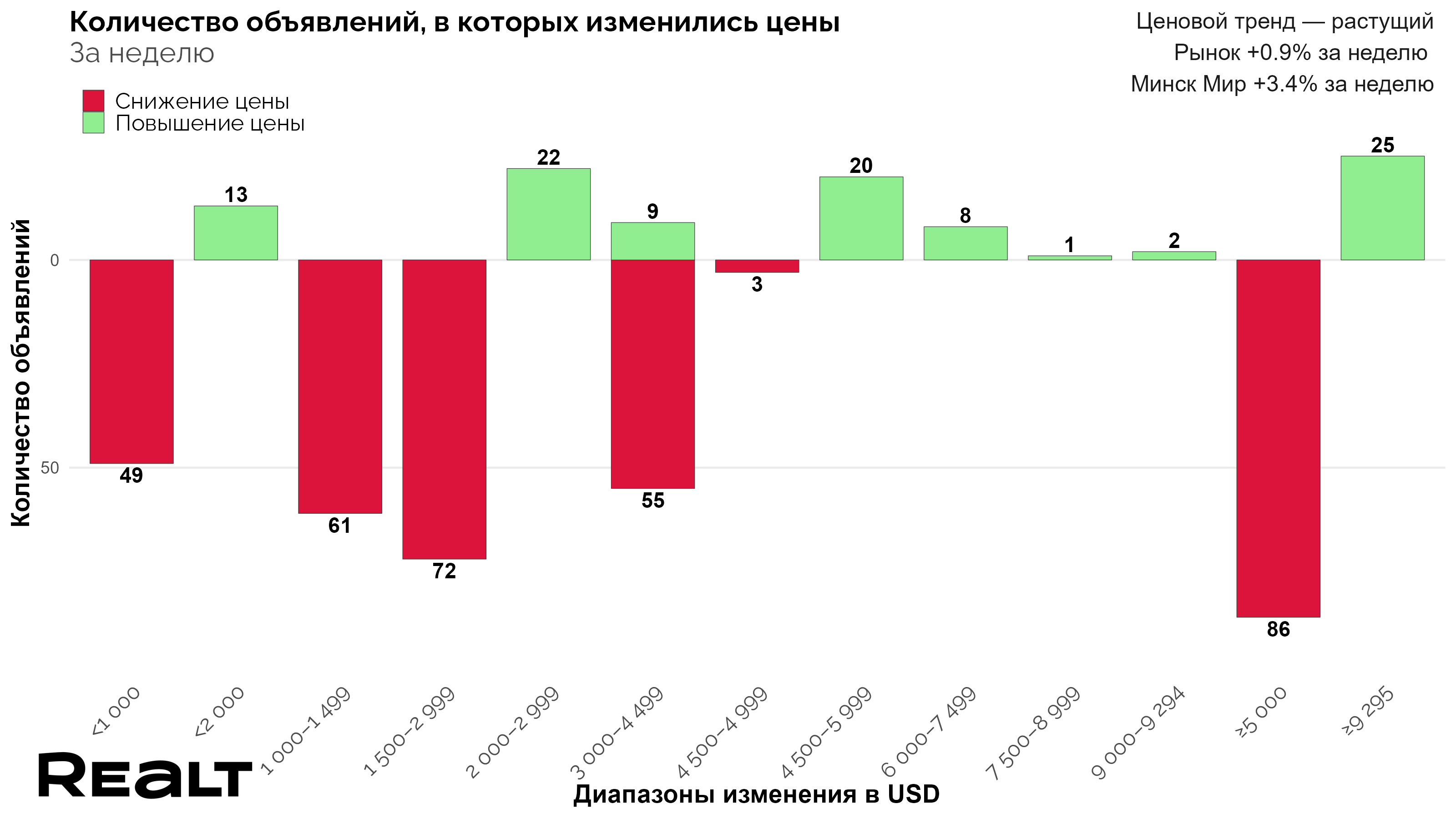 Средняя цена квадрата в объявлениях по всему Минску, за прошедшую неделю увеличилась на 0.9% до уровня 2246 $/м2. А в Минск-Мире прирост составил 3.4% до 2388 $/м2.