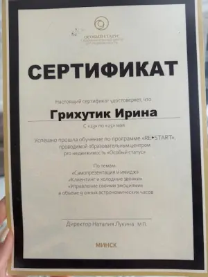 Ирина Грихутик рекомендовалась нам друзьями, ранее работавшими с ней, как профессионал в сфере недвижимости. По результатам наших взаимоотношений наши впечатления оказались еще выше. Восторг! Это не просто высококлассный специалист, а человек, который содействует решению еще и сопутствующих сделке массы вопросов. Всегда на связи, пунктуальна, юридически грамотна, имеет варианты решения возникающих сложностей. Только самые приятные впечатления и однозначные рекомендации к работе. Спасибо!