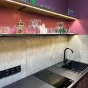 Кухня со всей необходимой посудой, чайником, холодильником, варочной панелью, микроволновой печью, кофемашиной. Гостям бесплатно предоставляется чай, кофе, сахар, соль, молоко, питьевая вода.