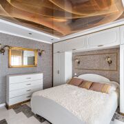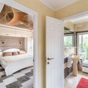 - «Романтика» — комната в большом доме дышит умиротворением и покоем. Приглушённые бордовые тона, зеркала, классическая полоска настраивают на романтический лад. А ещё здесь есть сюрприз: за зеркальной дверью расположена маленькая комната с полноценной двуспальной кроватью.