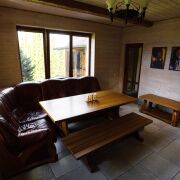 В домике есть всё для комфортного проживания. Застекленная терраса с печь-барбекю где в любую погоду можно приготовить кулинарные шедевры начиная от шашлыков до плова и шурпы. Огромная гостинная с камином, большим кожаным диваном и скамьей у дубового стола, удобные шизлонги, стоит прилечь на которые сразу попадаешь в гости к Морфею. Имеется зона кухни со всем необходимым (холодильник, варочная панель, микроволновка, посудомойка, электрочайник, кухонная утварь, шампуры, решётка, штопор...), душевая, большая ванна, отдельный санузел с псевдобидэ, ТВ, Wi-Fi 5G. В домике три спальни открыв окна в которых вы почувствуете дыхание леса. Спальни отделаны деревом, винтажные светильники и бра из гималайской соли придают неповторимый шарм помещениям. На стильных кроватях с ортопедическими матрасами приятно и удобно отдыхать. Сердце домика - это потрясающая русская баня на дровах с сибирским кедром на стенах, ненагревающимся абашем на полках и огромной царской печью. Печь закрытого типа обшита талькохлоридом, камни - нифритовые минералы. Пар - божественный!
