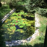 На улице вы увидите крытый бассейн, а также ухоженный дворик с качелями и фонтаном.