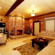 - гостиная с панорамными окнами и видом на озеро с невероятно красивым камином, огромным 7-ми метровым диваном, уютными креслами, небольшой библиотекой и настольными играми, и караоке.