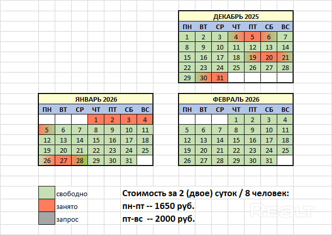 Полная стоимость за 2 сут/8чел ~ 1650р/будние, 2000р/вых. Доплата за количество человек 40руб/чел/сутки. На одни сутки цена = 2 суткам. Ранний заезд и поздний отъезд без доплат. ТГ: Точная цена по запросу. Дом укомплектован. Территория 15 соток, видеонаблюдение. В 500м от дома биологический заказник. Кухонный стол - макс. 12 чел. Сауна на дровах +150 руб. Одновременно 2-4 человека. Не для шумных компаний и алко вечеринок. Культурные мероприятия приветствуются. Заключается договор.
