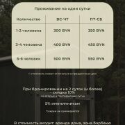 Идеальное место для отдыха в уединении с природой! Размещение до 6 человек. Расположение в 7 км от города Молодечно, 70 км от Минска! Цены на проживание: 1-2 человека (вс-чт: 300 BYN сутки; пт-сб: 350 BYN сутки), 3-4 человека (вс-чт: 400 BYN сутки; пт-сб: 450 BYN сутки), 5-6 человек (вс-чт: 500 BYN сутки; пт-сб: 550 BYN сутки). Для подтверждения бронирования требуется предоплата! Дополнительно: баня и купель-джакузи.