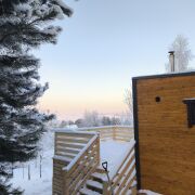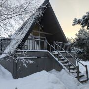 Внутри 2 этажа, 4 спальных места, небольшая кухня, холодильник, сан узел (туалет и душ). Есть бойлер, индукционная плита на 2 конфорки, электрический чайник, посуда, полотенца.