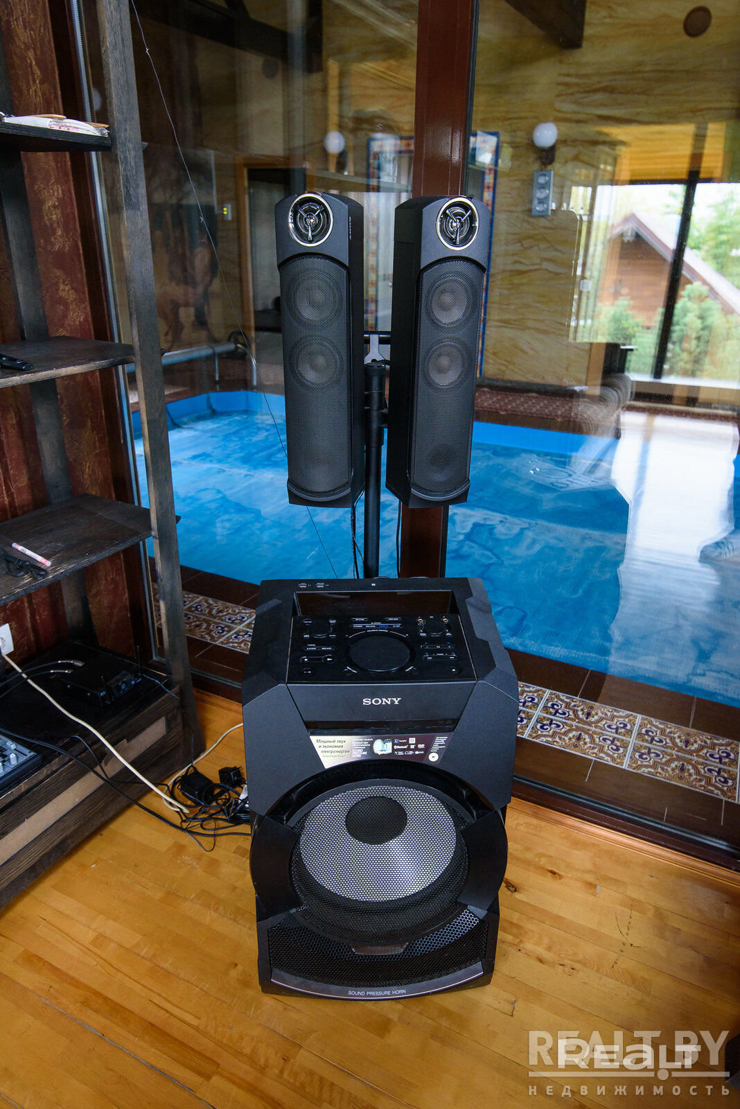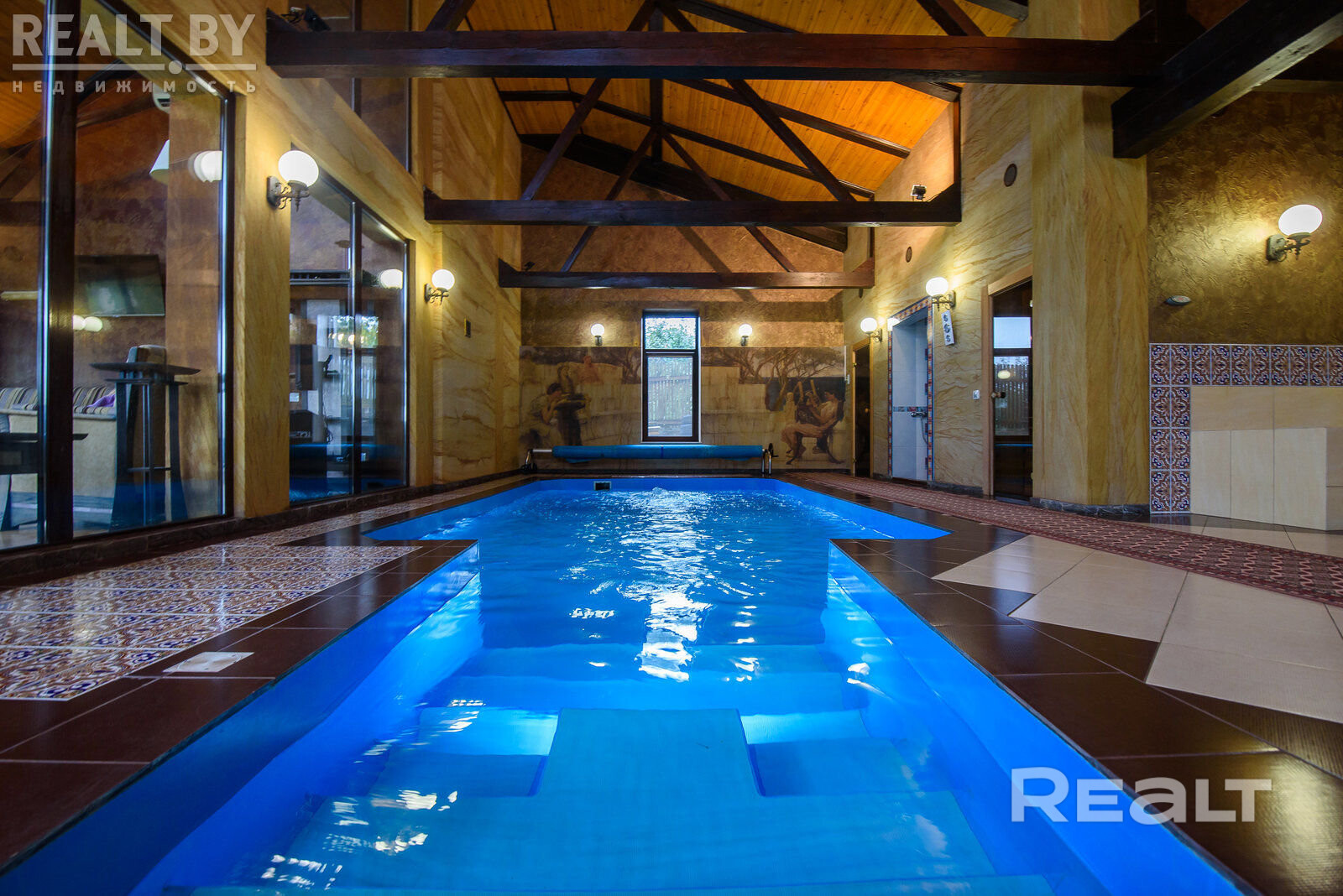 большой бассейн с подогревом, подсветкой, гидромассажем и системой фильтрации воды
