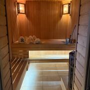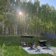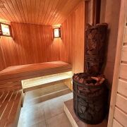 В бане предусмотрена комната отдыха, а с участка открываются красивые живописные виды и выход в лес.