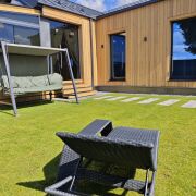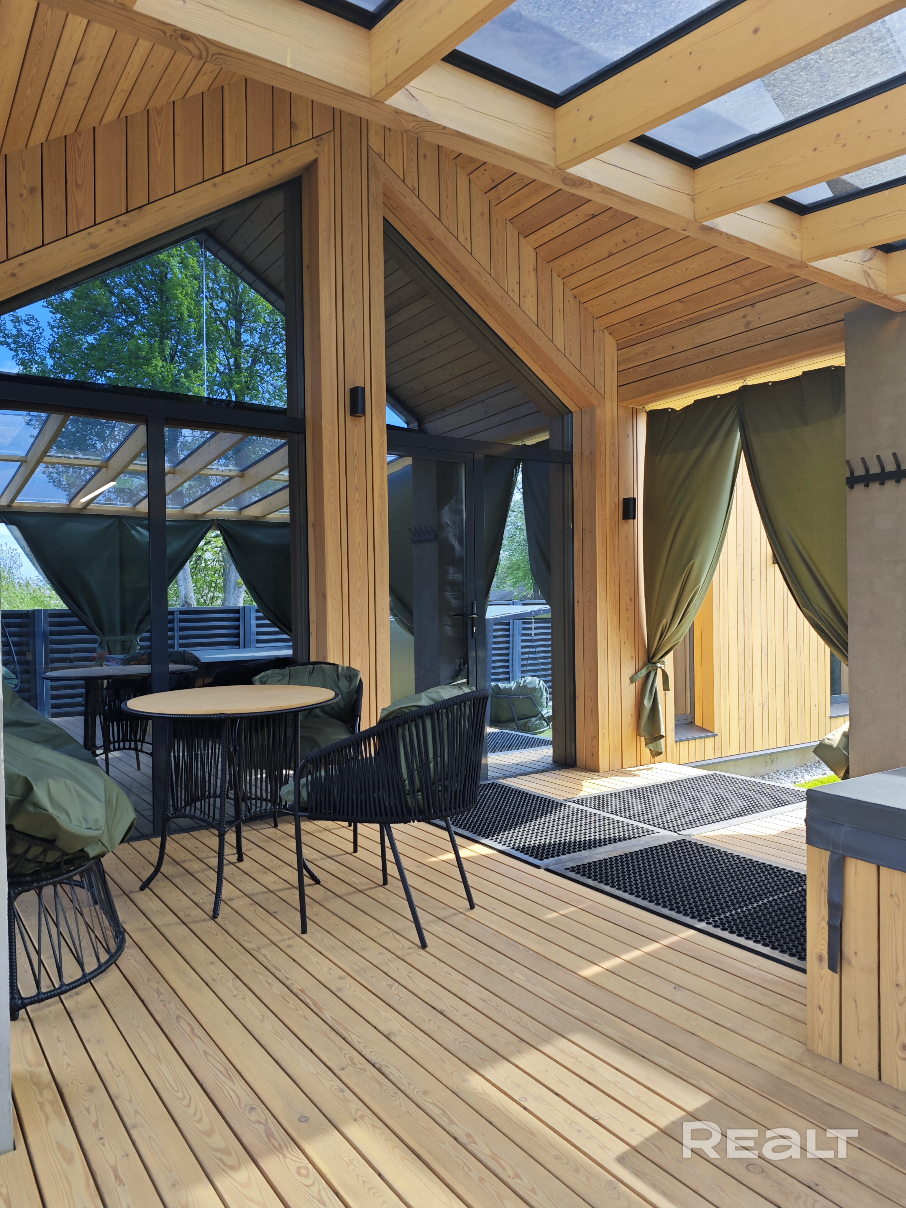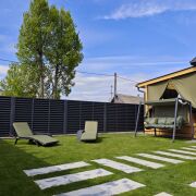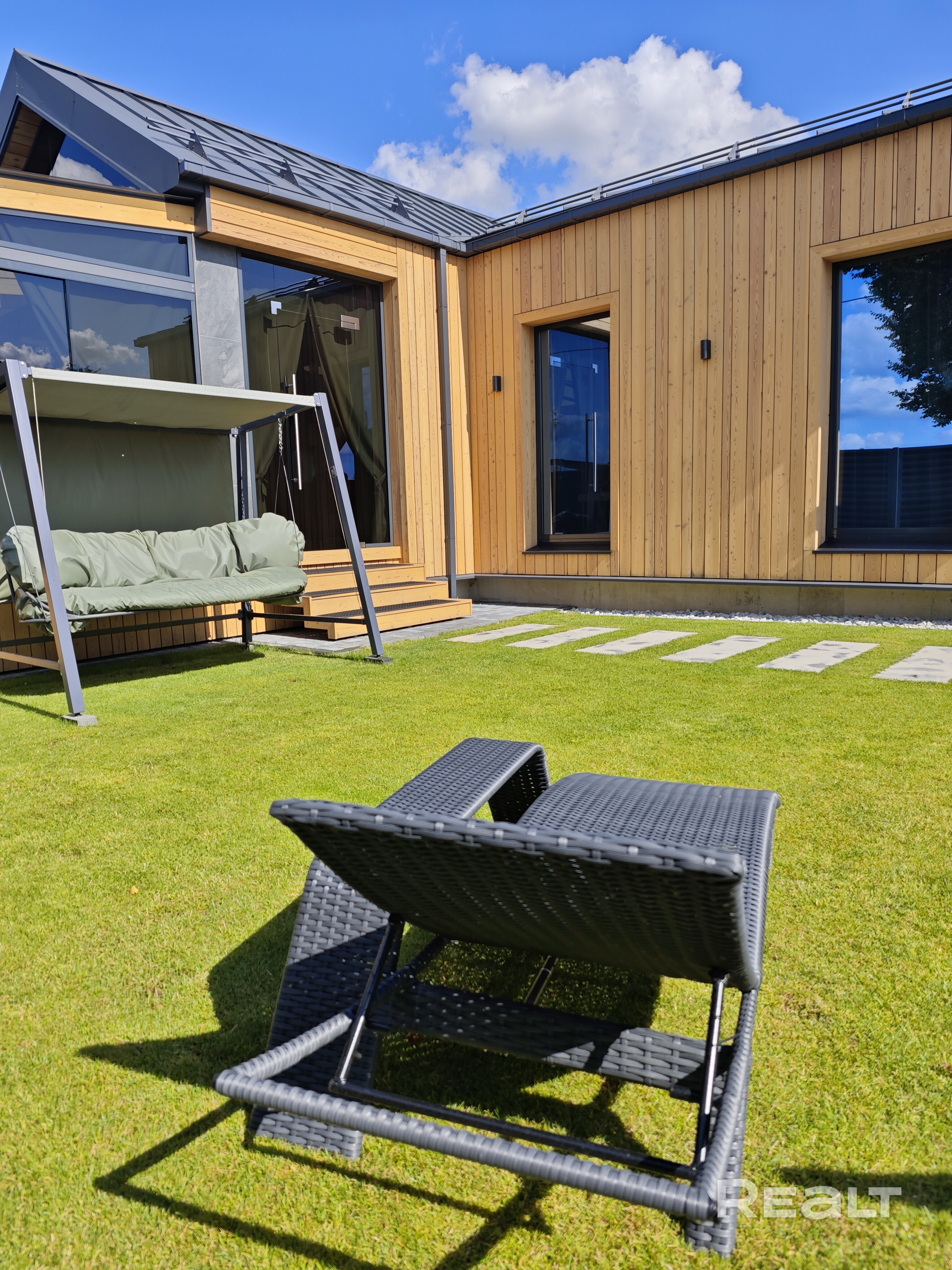 На территории - большая зона барбекю (казан, шампуры, решётки для гриля, разделочные доски, угли 1 пакет, дрова для казана), батут, мини-баскетбольная площадка, шезлонги, садовые качели, крытая терраса с подвесными качелями и столиком с креслами. Зелёная зона во дворе с ландшафтной подсветкой.