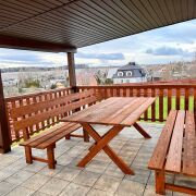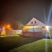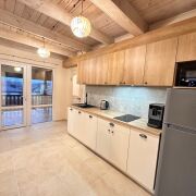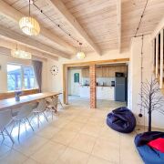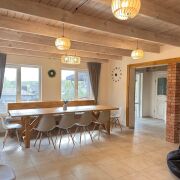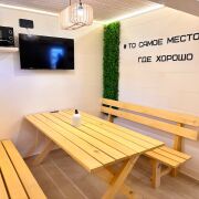 На 1-м этаже просторная комната для отдыха. Большой обеденный стол до 14 чел. Есть вся необходимая посуда и техника ( кофемашина, микроволновка, посудомоечная машина и т.д.). Караоке. Выход на террасу с обеденной зоной и зоной барбекю ( шампуры, решётка).