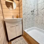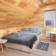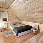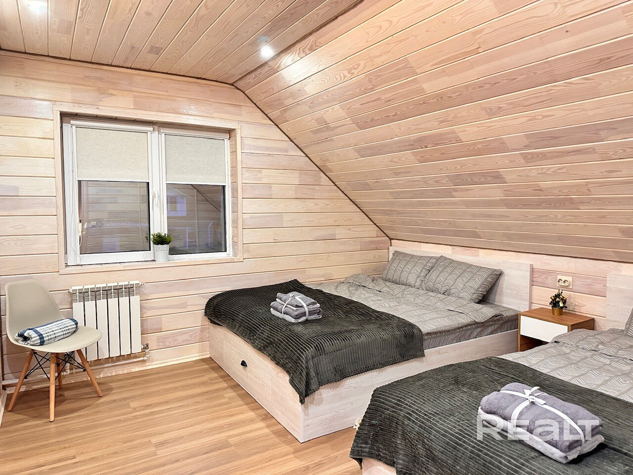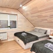 На 2-м этаже 3 спальные комнаты с двуспальными кроватями и ортопедическими матрасами, 2 диван-кровати. Постельное бельё. Душевая. Гостям предоставляются тапочки, полотенца, шапки для бани. Баня оплачивается отдельно ( 50р/час от 3-х часов). При бронировании более 2-х суток возможна скидка.