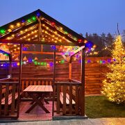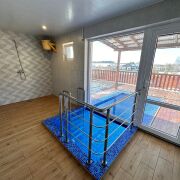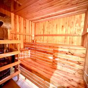 Баня с опцией второго дыхания( во время парения Вы дышите прохладным воздухом с улицы через отверстие в полкЕ, на котором лежите ). Бассейн с подогревом, занырнув в который, можно вынырнуть уже на улице.