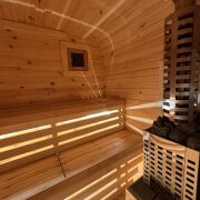 Баня с панорамным остеклением. Уникальное пространство, где традиции встречаются с современным дизайном. Огромное окно наполняет парную светом и создает ощущение простора для незабываемого отдыха и релаксации.
