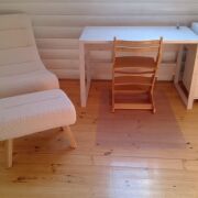 На 1-м этаже расположены кухня совмещенная с обеденной зоной и выходом на террасу, уютная гостинная с камином на дровах, санузел, котельная, постирочная, мастерская. Лестница ведет на 2-й этаж, где находятся четыре жилые комнаты, 2 ванные, тренажерный зал.