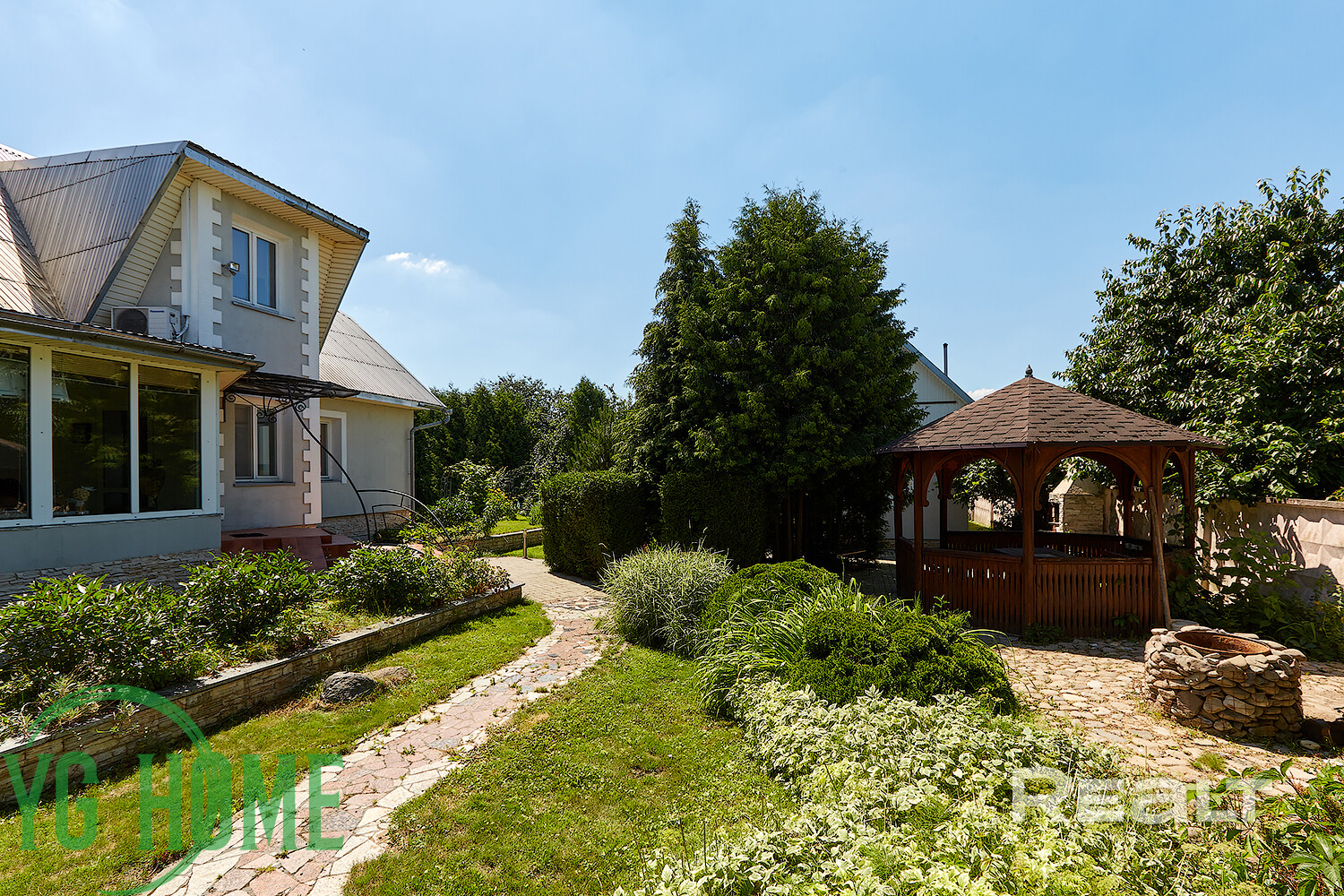 4 спальни, кабинет, гостиная, остекленная терраса с камином, 2 с/у, постирочная, бассейн.