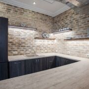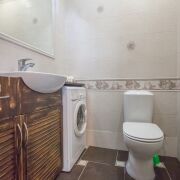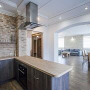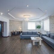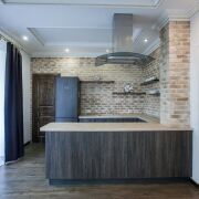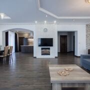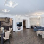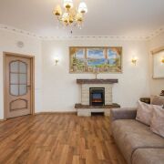 На первом этаже вы найдёте просторную гостиную площадью 50 м2, которая объединена с кухней площадью 20 м2. Здесь установлена вся необходимая современная техника: варочная панель, духовой шкаф и посудомоечная машина. Из гостиной можно выйти на просторную веранду.