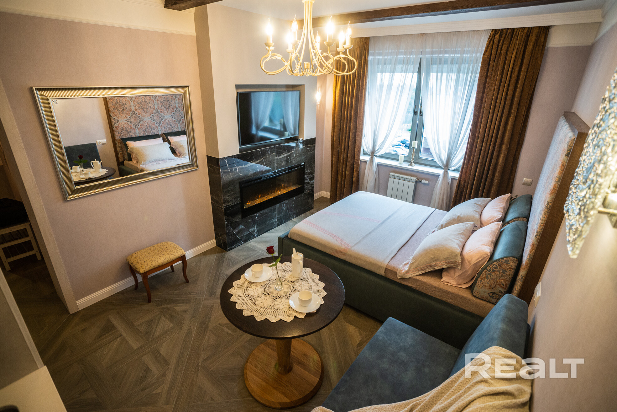 НОВИНКА! Роскошная квартира-студия в уникальном квартале Минска с живописным видом на пруд и Храм. Мы создаем интерьеры с любовью и позаботились о максимальном комфорте для ВАС: продуманный дизайн, мебель натурального дерева, экологические материалы, LED-камин, электрические ставни на окнах (затемнение до 100%), кондиционер, подсветки и LED-свечи, SMART TV с большой диагональю, ванна-джакузи с хромотерапией, тропический душ, просторная душевая и туалетная комната оборудована сантехникой премиум класса, кухня полностью укомплектована. Мы осуществляем профессиональную уборку перед каждым заселением. Чистое выглаженное бельё и пушистые полотенца. В студии не курят, поэтому в квартире свежий запах. В квартире хорошая звукоизоляция - гостей не потревожат посторонние звуки. Ухоженный подъезд и красивый тихий двор, охраняемые парковки. Красивый вид из окна на пруд и Храм. Детские и спортивные площадки. В шаговой доступности метро "Спортивная", фитнес центр "Yestoday" с бассейном и теннисными кортами, супермаркет "Скала", ресторан "Васильки", парк, медицинский центр "Конфиденс". Студии рассчитаны для романтических встреч и путешествующих. Отлично для фотосессий и жениха с невестой. Мы гарантируем Вам комфорт, чистоту, конфиденциальность и максимум удобства! Обратите пожалуйста внимание, для путешествующих двумя, тремя и даже четырьмя парами (можно с детьми), у нас есть аналогичные студии в этом же доме.