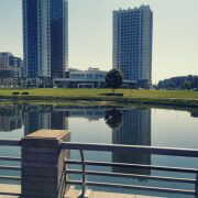 Возле дома водная Слепянская система с катамаранами и лодками и пешеходная зона вокруг Нац. Библиотеки.