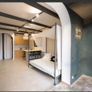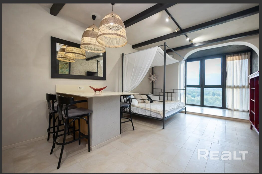 Удобная студия с обеденной и жилой зонами, отдельная гардеробная и совмещенный санузел.