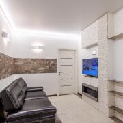 Просторная гостиная с комфортным диваном и современным телевизором для ваших любимых фильмов.