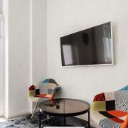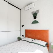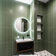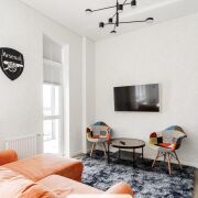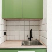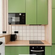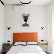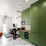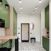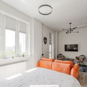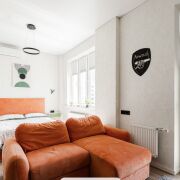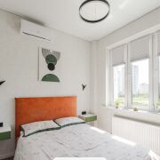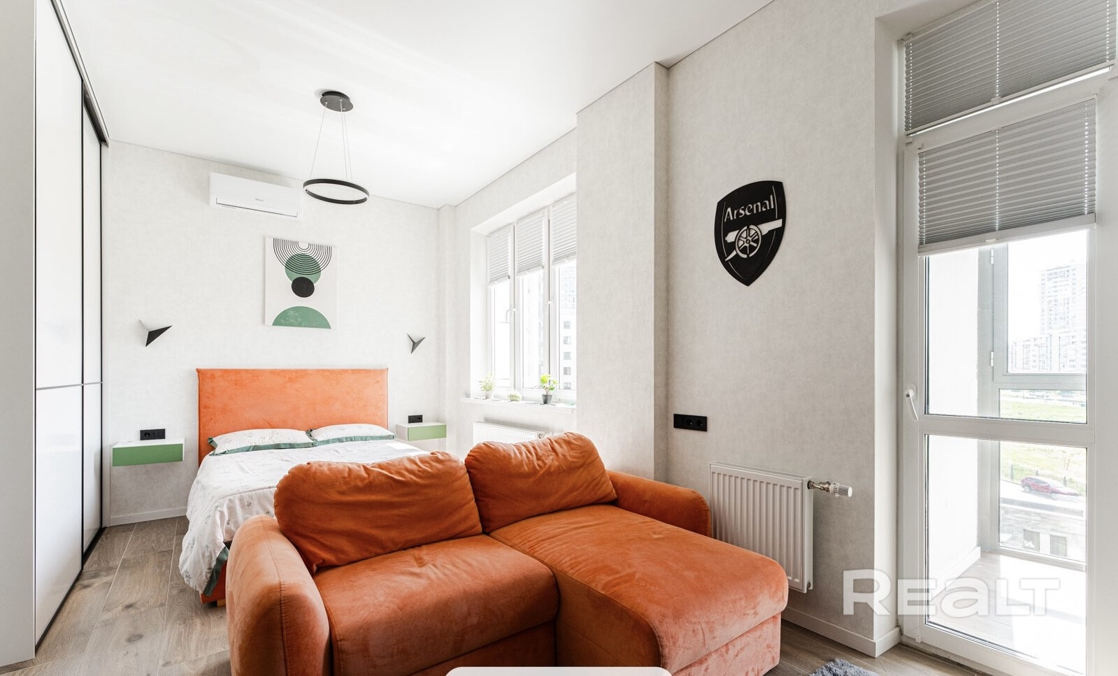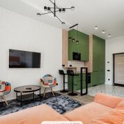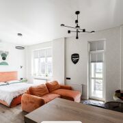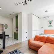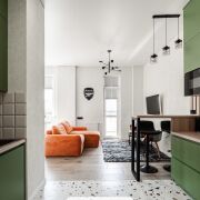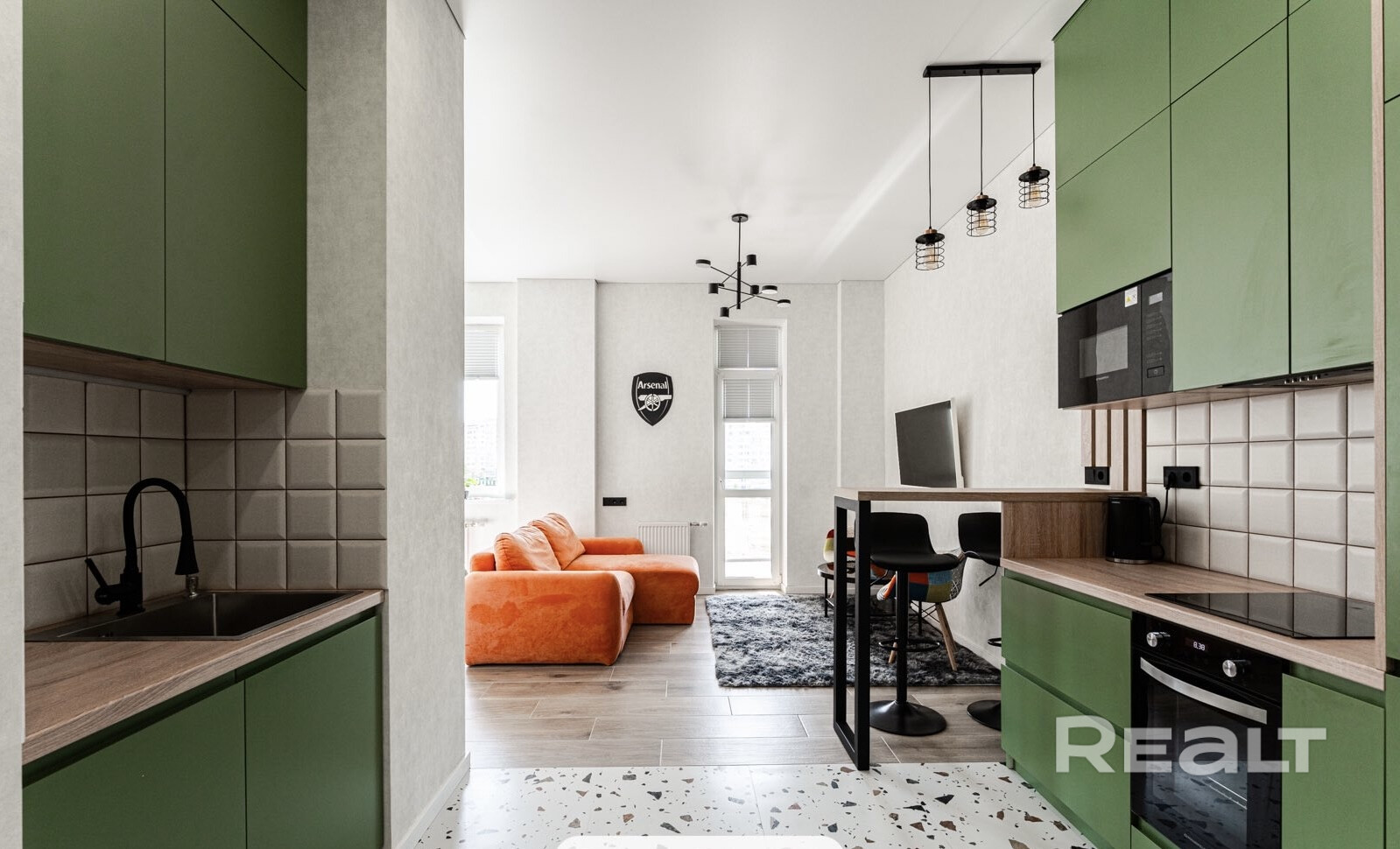 Шикарная квартира где благодаря продуманной планировке, удалось организовать все необходимые функциональные зоны. Оригинальное решение с кухней, размещенной с двух сторон, что создает ощущение простора и функциональности. Представьте себе: с одной стороны — рабочая зона, с другой — уютный уголок для завтраков.Основное пространство — это единая зона, где гостиная с диваном и ТВ плавно переходит в спальню. Никаких перегородок здесь нет. Такой вариант подойдет для одного человека или пары, которая не готова расставаться друг с другом ни на секунду.Интерьер уже с порога задает настроение: зеленая кухня, ярко-оранжевые диван и кровать, разноцветные кресла и акцентные детали, которые могут поднять настроение после тяжелого рабочего дня.Гостиная зона визуально отделена от прихожей, создавая ощущение отдельного пространства. Отсюда открывается потрясающий вид на город, и, что особенно приятно, из гостиной можно выйти на просторную лоджию, застекленную от пола до потолка — идеальное место для утреннего кофе или вечернего отдыха.Санузел, совмещенный, но при этом достаточно просторный, выполнен в яркой цветовой гамме.