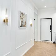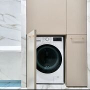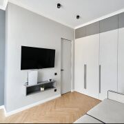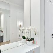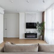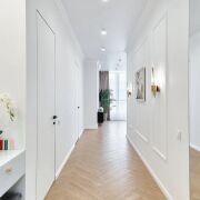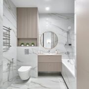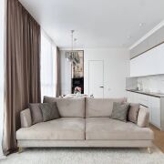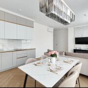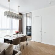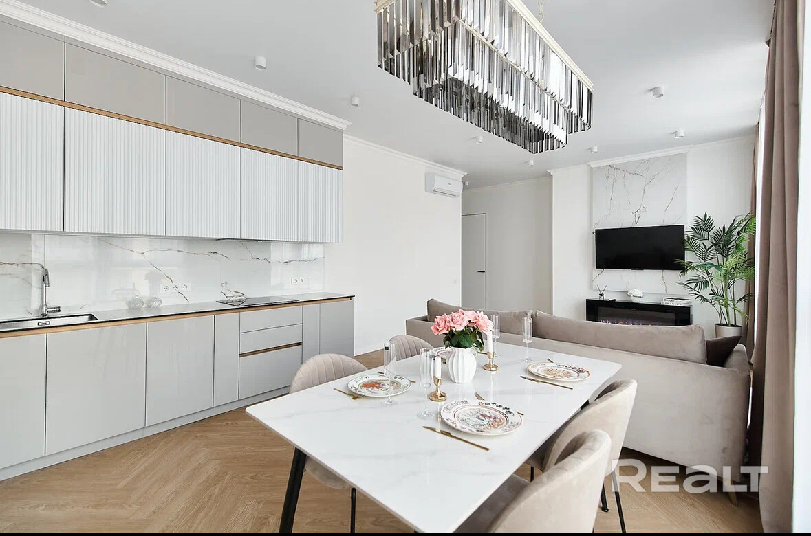 Кухня оснащена техникой премиальных марок: индукционной плитой, духовкой, свч, посудомоечной машиной, холодильником, чайником.