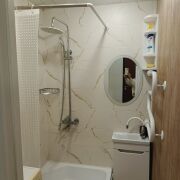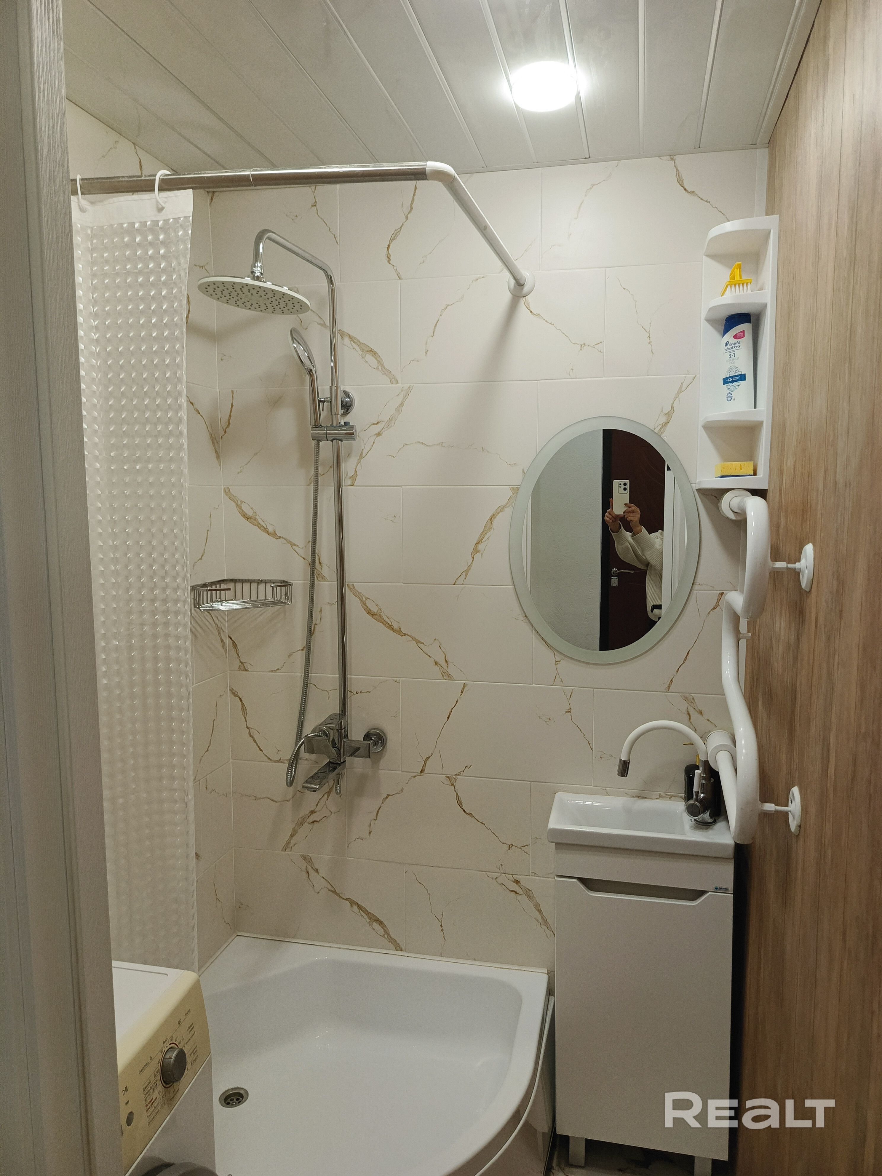 В ванной — душевая кабина, стиральная машина, фен, мыло и туалетная бумага.