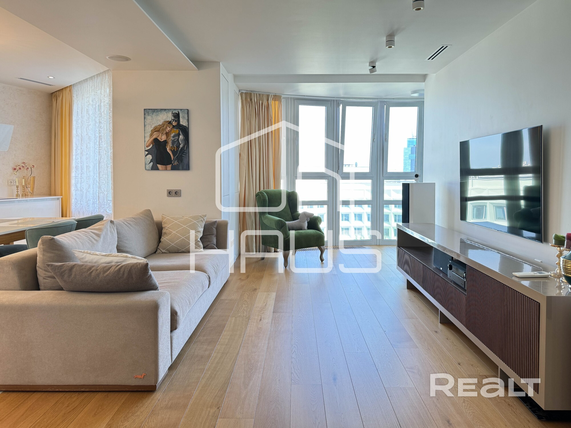 Высокие окна обеспечивают отличный дневной свет. В квартире две спальни, два санузла, гостиная, кухня, гардеробная и два парковочных места на крытом паркинге. Детская комната полностью меблирована.