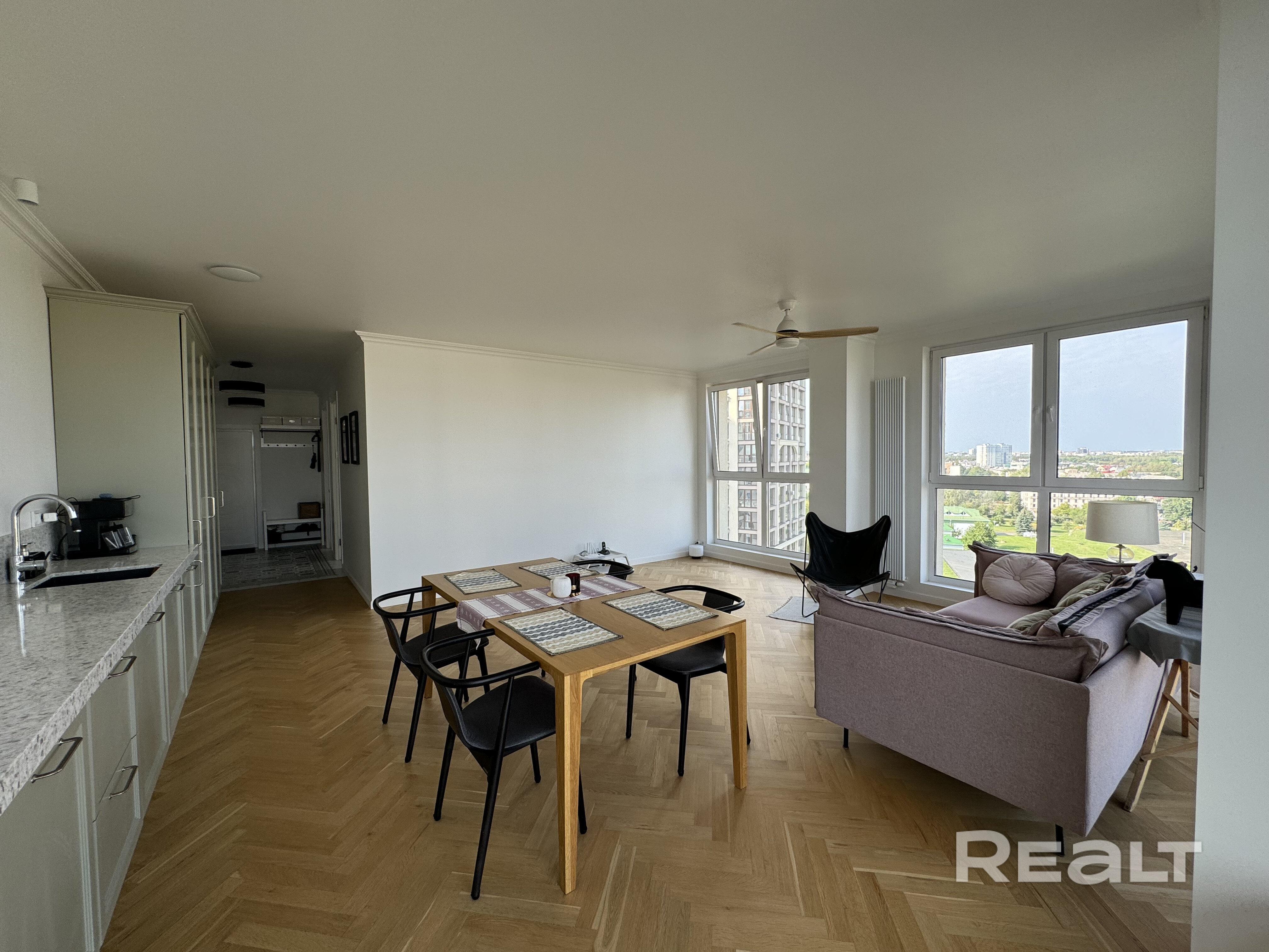 Сдаётся стильная квартира на ул. Макаёнка. По документам 1-комнатная (идёт согласование перепланировки). 1100 + коммунальные, при оплате за 6 мес — 1050 (по курсу НБРБ). С 25.04.26. 5 мин до метро и парка, вид на пр. Независимости и Нац. библиотеку. 2 санузла, каменная ванна, паркет, каменные столешницы, проектор, очиститель и увлажнитель воздуха. Детская — под спальню/кабинет. Полная комплектация. Долгосрочно, по договору. Связь: ТГ / Viber