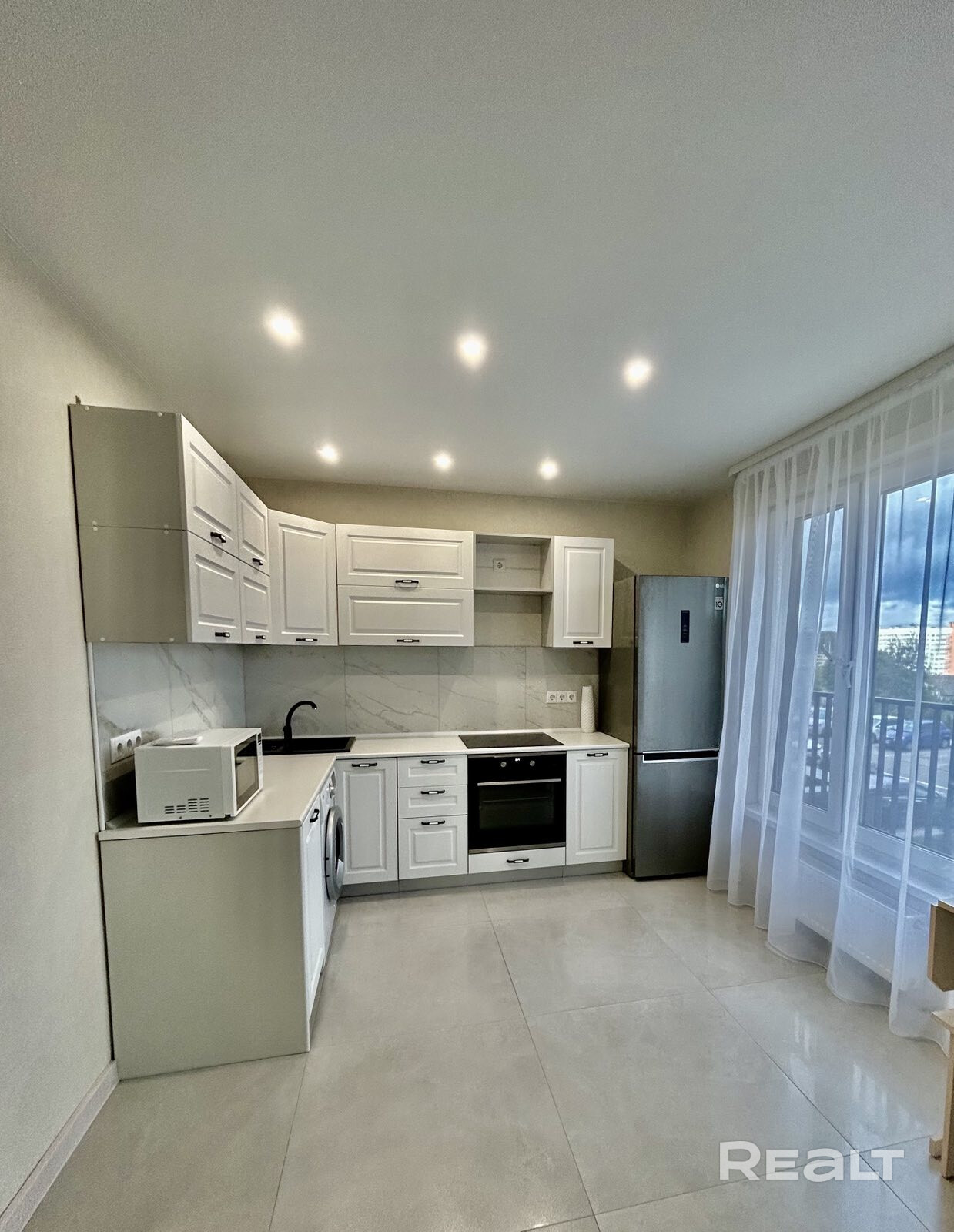 Квартира светлая с окнами в пол. Полностью укомплектована мебелью (встроенная кухня, стол с табуретами, мебель в ванной, тумба и шкаф) и бытовой техникой (холодильник, варочная поверхность, духовой шкаф, посудомоечная машина, вытяжка, микроволновая печь, стиральная машина, телевизор).